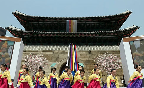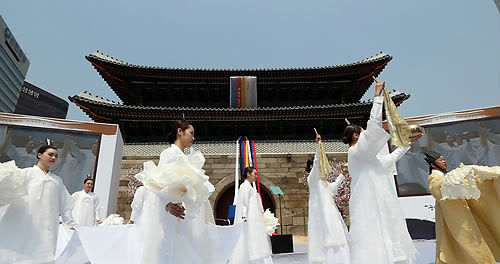'길 닦음 행렬'이 지나는 세종로와 광화문광장에서는 오후 2시부터 국·공립 공연단체와 민간 공연단체가 어우러져 자유연희마당을 곳곳에서 펼쳐졌다.