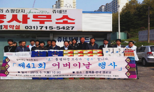 기흥구(구청장 김영명)동백동은 지난 7일 어버이날을 맞이하여 은혜에 보답하고자 37개 경로당을 방문하는‘사랑나눔 잔치’를 열었다.