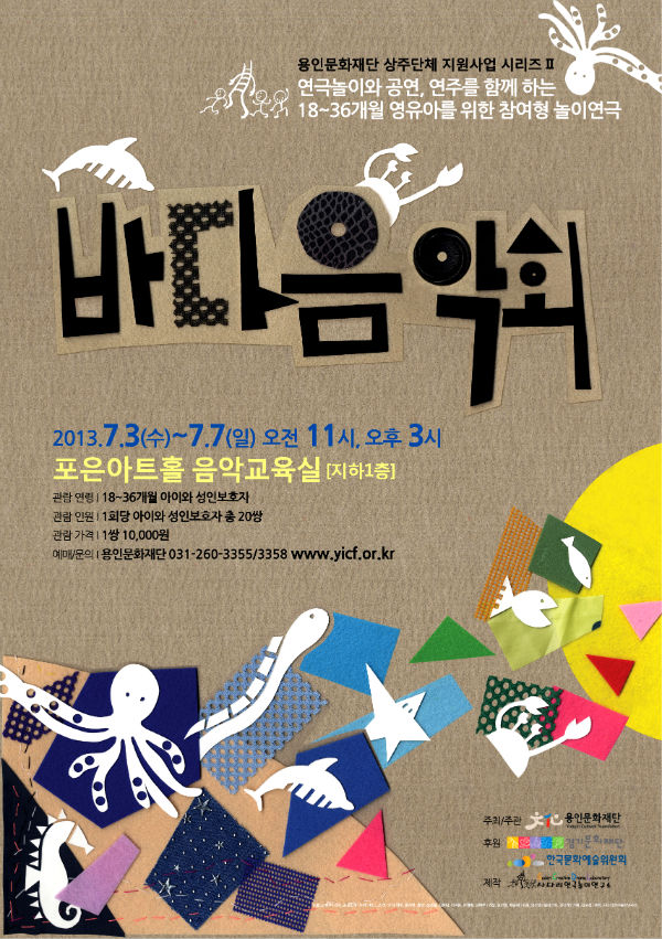 (재)용인문화재단이 상주단체 지원사업의 일환으로 사다리연극놀이연구소와 공동으로 진행하는 참여형 놀이연극 <바다음악회>가 7월 3일부터 7일까지 포은아트홀 내 음악교육실에서 열린다.