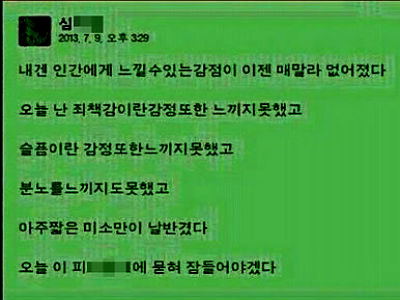 심군은 지난 9일 오후 3시 29분, 자신의 SNS에 "내겐 인간에게 느낄 수 있는 감정이 이젠 메말라버렸다. 오늘 난 죄책감이란 감정도 슬픔도, 분노도 느끼지 못했다. 오늘 피 냄새에 묻혀 잠들어야겠다."고 썼다.