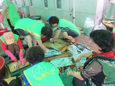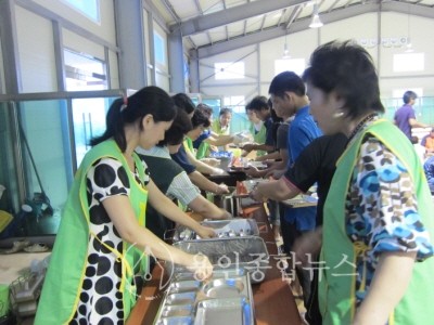 모현면사무소에 설치된 임시 급식소에는 수해피해를 입은 주민과 자원봉사자들을 위해 급식을 실시하고 있으며, 농협용인시지부에서 급식을 위한 부식을 준비하고 신갈농협과 수지농협 고향주부모임 회원들이 점심과 저녁 식사 시간에 200여명에 대한 식사를 제공하였다.