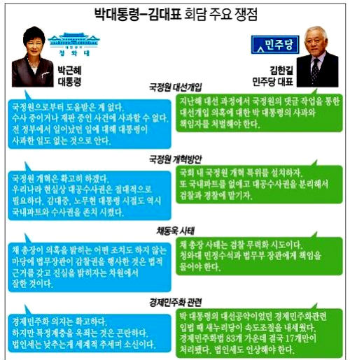 주로 박 대통령과 김 대표 간에 '담판' 형식으로 이뤄진 회담은, 서로 간에 높은 불신의 벽만 확인한 채 막을 내렸다. 박 대통령은 국정원 사태에 대한 사과와 국정원의 전면적 개혁, 채동욱 검찰총장의 사의 표명을 둘러싼 관련자 문책 요구 등, 김 대표가 꺼낸 7개항 요구 중 어느 것 하나 수용하지 않았다.