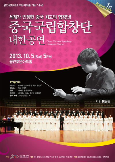 용인의 고품격 복합 문화 공간 포은아트홀 개관 1주년 페스티벌은, 10월4일부터 29일까지 펼쳐지며, 그 중 중국국립합창단 내한공연은 10월 5일(토) 오후 5시에 개최된다. 자세한 사항은 용인문화재단 홈페이지(www.yicf.or.kr)에서 확인할 수 있다.