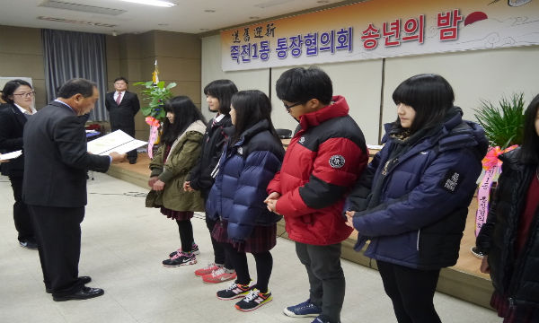 죽전1동 통장협의회(회장 김명규)는 지난 12일, 죽전1동주민센터에서 열린 ‘송년의 밤’ 행사에서, 관내 중·고등학생 20명에게 장학금 460만원과, 저소득가정과 홀로어르신 등 어려운 이웃 28가구에 쌀 28포(20kg)를 전달하는 전달식을 가졌다.