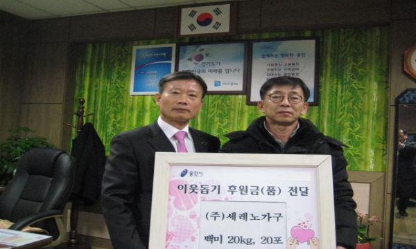 ㈜세레노 가구는 지난 2013년도에도 이동면 관내 어려운 이웃들에게 백미를 기탁하는 등, 지역사회 나눔 실천에 앞장서고 있는 지역의 우수기업이다.