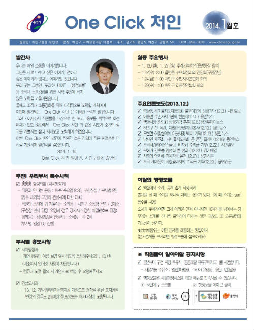 ‘원 클릭 처인’은 각종 행정소식, 지역현안, 주요 공사현황 등 직무수행에 필요한 정보, 부서별 시책, 수범사례 등 직원들이 관심을 가질만한 뉴스로 구성되어‘직원을 대상으로 한 월간 업무보고’의 성격을 지니게 된다.