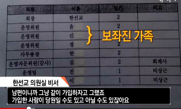 뉴스타파는 “이 단체 회원명부를 조사해 보니 회원 119명 중 75명이 한 의원 보좌진과 그 가족, 지인, 새누리당 당원 등 한 의원과 직·간접적으로 연관된 사람이었다.”고 밝혔다.