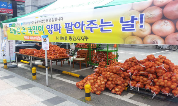 NH농협 용인시지부(지부장 홍재범)는 양파의 작황호조와 소비부진으로 어려움을 겪고 있는 농민들을 돕기 위한 ‘오늘은 온국민이 양파 팔아주는 날’행사를 27일 실시하였다.