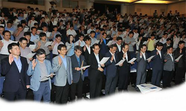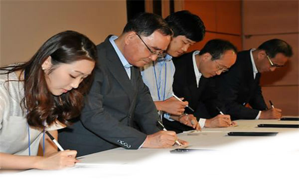 정홍원 국무총리가 23일 충남 천안시 교보생명 연수원에서 열린 부패척결 워크숍 총리실 전직원 결의대회에서 추경호 국무조정실장 등 직원들과 함께 결의문을 작성하고 있다.