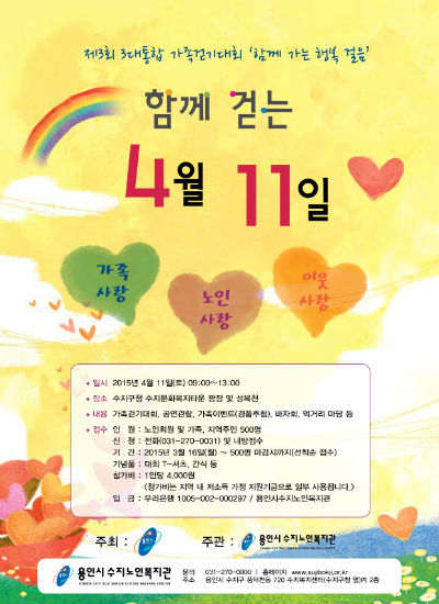 올해로 3회째를 맞이하는 가족걷기대회는 2015년 4월 11일(토) 오전 9시부터 진행되며, 용인시수지노인복지관 광장(수지구청 내)에서 시작하여 탄천을 따라 왕복 4km(어르신기준 1시간가량)를 걷는 코스로 이루어져 있으며, 스 중에 다양한 이벤트와 볼거리를 통해 봄의 향기를 만끽하며 가족들과 걸을 수 있도록 구성되어 있다.