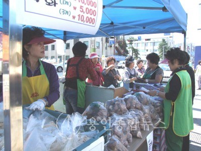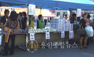 우리농산물 애용 증진운동을 모터로 한 이웃과 함께 어우러지는 축제의 장으로 용인농협(조합장 조규원)과 주부대학 총동창회(회장:소진만)에서는 27일 용인농협 주차장에서 불우이웃돕기 성금 마련을 위한 바자회를 개최했다.