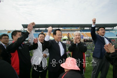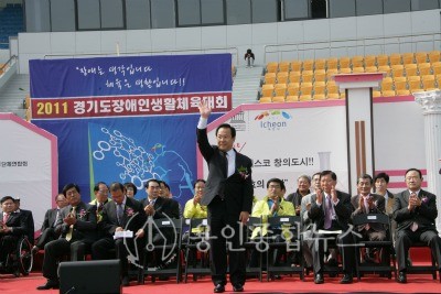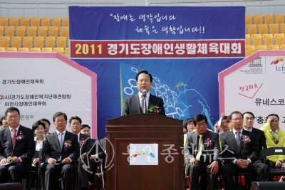 김학규 용인시장이 장애인 생활체육 활성화와 저변 확대에 관심과 성원을 보내기 위해 5일 이천시 종합운동장에서 열리는 2011경기도 장애인생활체육대회에 참석, 대회 참가자들을 비롯해 용인시 선수단과 임원진들을 격려했다.