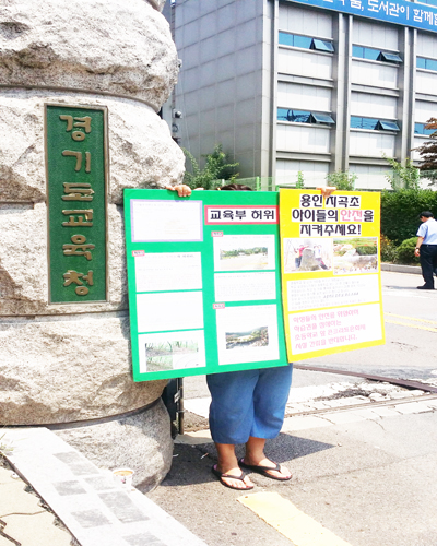 지곡초교 학부모들은, 불과 30m 떨어진 학교 앞 산에 설립 추진 중인 콘크리트혼화제연구소 공사에 반대해왔다.