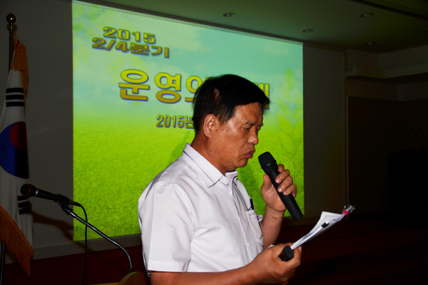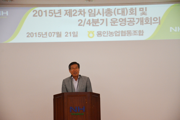 또한 대의원 여러분과 이사님들 모두 건강하게 참석하여, 정말 마음이 놓였습니다. 하지만 극심한 가뭄으로 인해, 정말 어렵고 힘든 2015년도 상반기를 보낸 것 같습니다. 상반기 사업추진 현황을 보고 드리자면, 상호금융예수금은 전년대비 6.34% 성장하였으며,(예수금 5천6백4십6억원 달성)조합원 환원사업비 16억 5천4백만원을 지원하기도 했습니다. 그 외 더 자세한 사업설명은 상임이사께서 직접 설명이 있겠습니다. 우리 용인농협은 안전하고 든든한 농협입니다. 파머스 마켓(경제사업) 및 신용사업 이용에 많은 관심과 이용을 하여 주시길 당부 드리며, 올해에도 풍년농사 기원 드리면서 늘, 건강하시고 행복하시길 기원 드립니다.” 라며 인사말을 하였다.