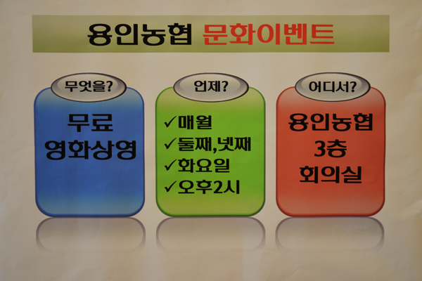 이날 임시총회의에 앞서 영화 명랑을 상영 하였는데, 용인농협 김경철 상무는 “매월 둘째 넷째 화요일 오후 2시, 용인농협 3층 대강당에서, 지역사회 환원사업과 문화이벤트의 일환으로 용인시민들에게 무료로 영화를 상영할 계획.”이라고 밝히기도 했다. 이날 함께 개최된 임시총회에서는, 개정된 용인농협의 정관을 만장일치로 가결해  총회를 마무리했다.