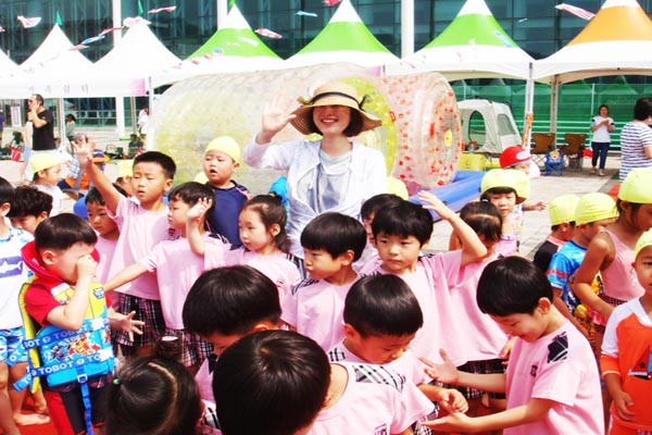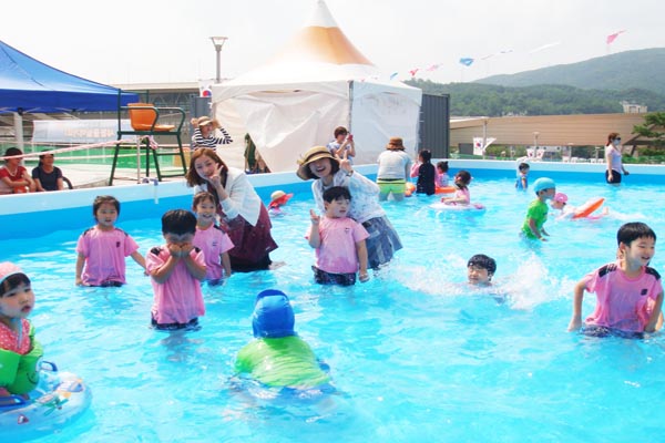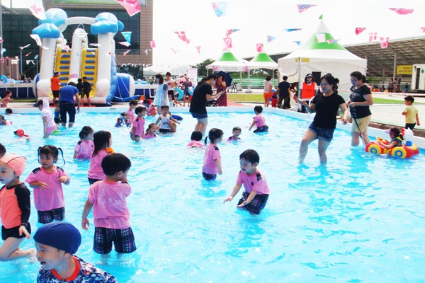 28일 오전, 용인시청 앞 광장에 무료로 개방된 어린이 수영장에, 오전 시간임에도 불구하고 약2.000여명의 어린아이들이 방학을 맟아 엄마 아빠의 손을 잡고 시원한 물놀이를 즐기고 있었다.