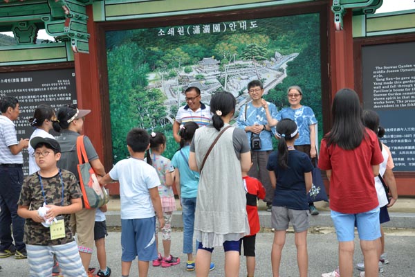 자연과 인공의 조화의 극치를 이룬 담양 소쇄원에 들른 수강생들은 입구에 시원하게 하늘로 뻣은 대나무에 대해 설명을 들으면서, 조광조가 기묘사화로 유배된 후, 죽임을 당하자. 제자였던 처사 양산보가 벼슬을 버리고 자연 속에서 살기 위해 고향에 지은 정원으로, 제월당. 광풍각. 대봉대등의 건축물이 있다. 그리고 자연을 거스르지 않고, 자연과 조화를 이룬 조선시대 원린건축의 백미라고 설명하는, 숲과 문화학교 강영란 교장의 설명을 들으며 감탄하기도 했다.