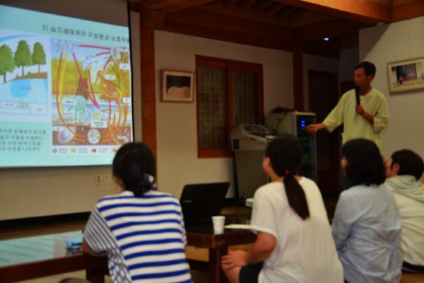 첫날 저녂 8시에는 전북대학교 생태문화연구소 주용기 소장의, ‘습지와 자연 생태계’에 대한 강의를 2시간에 걸쳐 들으면서, 우리나라의 습지와 자연생태계를 파괴해서는 절대로 안 된다는 인식을 깨닫는 한편, 인간과 자연이 함께 공존해야 된다는 주용기 소장의 명 강의를 들으면서, 노트에 깨알 같이 강의내용을 적기도 했다.