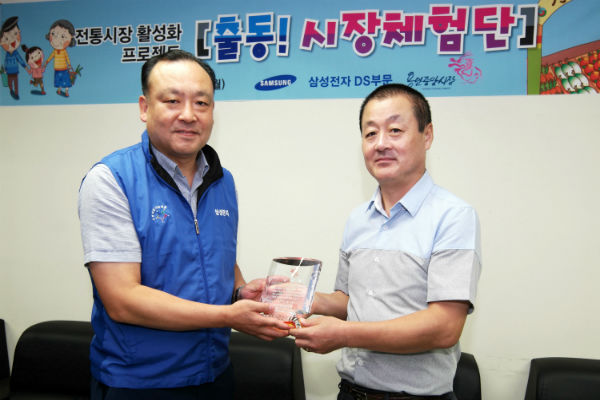 24일(월) 삼성전자 DS부문은 「출동! 시장 체험단」 캠페인을 통해 지역경제 살리기에 기여한 공로로, 용인중앙시장 상인회(회장 박영배 사진 우측)로 부터 감사패를 전달 받았다.