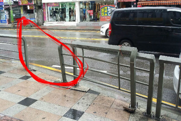 용인시 처인구 중앙동 L시네마 1층 상가 앞에, 시민들의 안전을 위해, 도로와 인도사이를 가로막은 방호용 휀스 2개가, 누군가에 의해 마음대로 훼손된 체 옆에 팽개쳐져 있다.