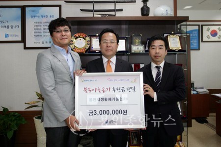 용인시 생활폐기물협회 관계자들이 7일 김학규 용인시장을 방문, 지역의 어려운 이웃을 위해 사용해달라며 성금 300만원을 기탁했다.