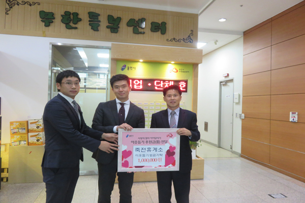 기탁된 성금 100만원은 용인시 기흥구 신갈동의 원룸에서 어렵게 살고 있는 전모씨 가정에게 전달되어 전세임대주택 보증금으로 귀하게 쓰일 계획이다.