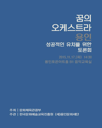 (재)용인문화재단은 오는 11월 17일 14시 30분 용인포은아트홀 음악교육실에서 ‘꿈의 오케스트라, 용인’의 성공적인 방안을 모색하고 앞으로 바람직한 사업추진을 위한 토론회를 개최한다.