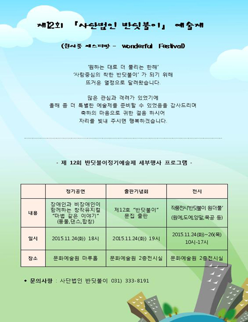 장애인과 비장애인의 다양한 문화 환경 조성에 기여해 온 ‘반딧불이예술제’의 열두번째 공연이 오는 11월 24일에서 26일까지 용인 문화예술원 전시실 및 공연장에서 개최된다.