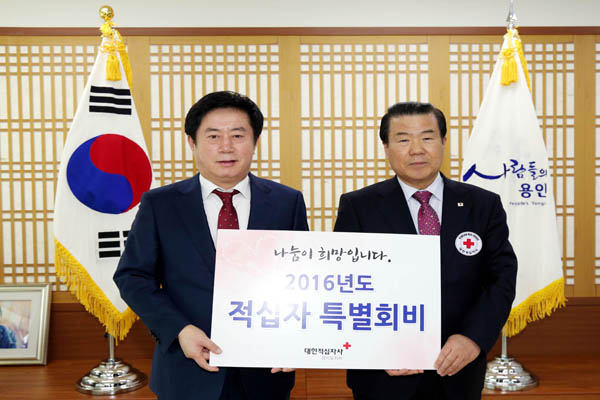 정찬민 용인시장은 지난 21일 시장실에서, 대한적십자사 경기도지회 김훈동 회장에게 적십자 특별회비 2백만원을 전달했다. 이날 전달식에는 용인시지구협의회 방희용 회장 등 적십자 임원진들도 참석하였다.