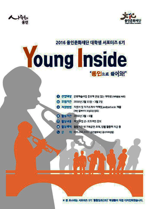 (재)용인문화재단은 문화예술에 관심 있는 대학생을 대상으로 대학생 서포터즈 ‘Young Inside’ 6기를 모집한다. 6기부터는 ‘젊은 대학생들이 용인문화재단 안에서 시민이 문화를 공유하도록 돕다’의 의미를 담은 ‘Young Inside’라는 새 이름으로 활동하게 되며, ‘Young Inside’라는 이름과 모집 포스터 등은 모두 5기 대학생 서포터즈가 직접 제작했다.