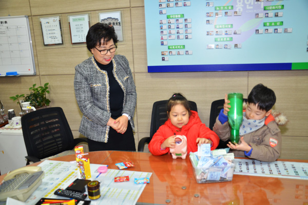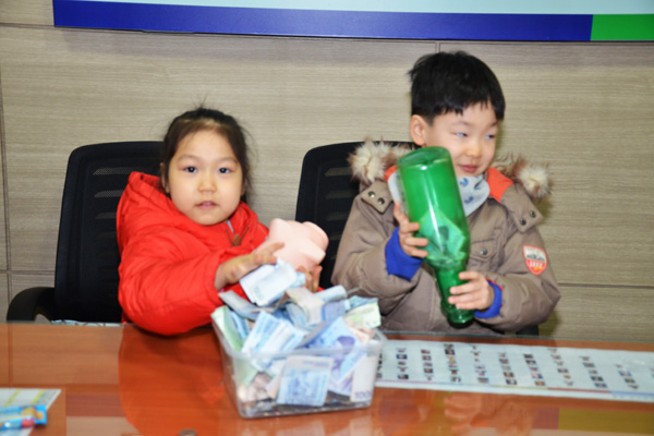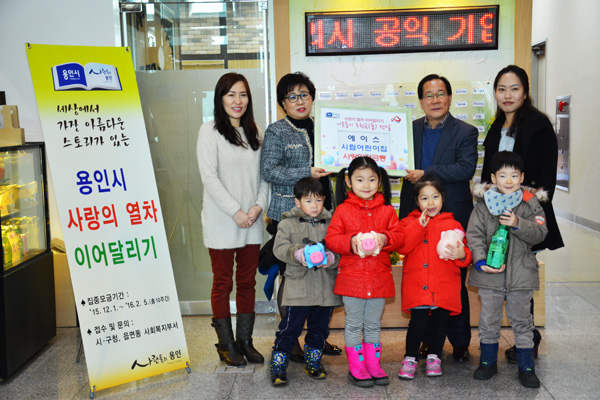 시립용인어린이집(구-에이스용인어린이집 / 원장 김경미)의 원아들이 그동안 집에서 받은 용돈과, 선생님들이 조금씩 보태어서 모은 벙어리 저금통을. 불우이웃돕기 ‘사랑의 열차 이어 달리기에’ 동참을 위하여 복지여성국에 전달했다.