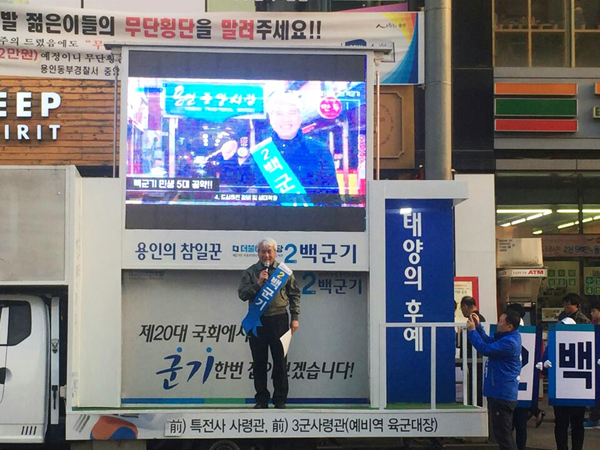 용인 갑에서 더민주당은 육군대장과 제3야전군사령관을 지낸, 현역 백군기 의원이 최초로 ‘컷오프’를 당하여, 조재헌 전 국회의원 보좌관과곽동구씨 등이 경선 후보군에 올랐으나, 전략 공천으로 기사 회상한 백군기 의원은, 새누리당 이우현 의원과 국민의당으로 출마한 조성욱 전 용인시의회 의장과 3자 대결을 벌이게 되었다.