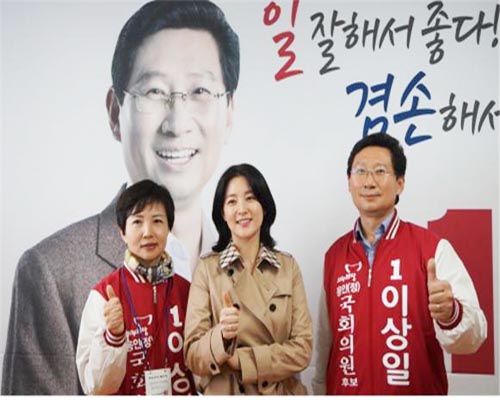 이영애씨는 이날 오후 용인시 수지구 죽전1동에 있는 이 후보의 선거사무소를 찾아, 선거운동을 해온 이 후보 부부를 응원하고, 선거사무원들을 격려했다.