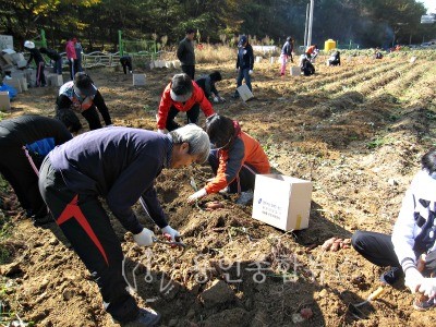 주변 초등학교 학생 60여명도 현장학습의 일환으로 고구마수확에 참여했다.