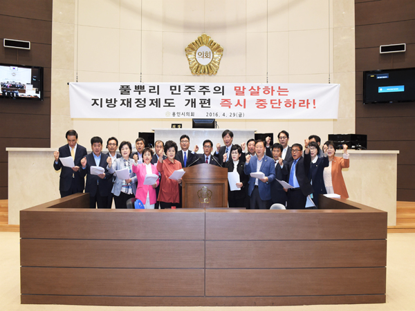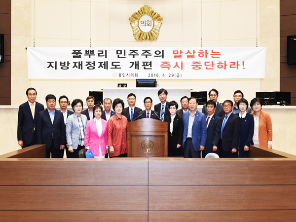 용인시의회는 4월 29일 11시, 긴급회의를 소집하여 정부에서 추진하는 지방재정 개혁안에 대해 기획재정국장의 보고를 받고, 용인시 자치재정의 존립을 위협하는, 정부의 지방재정제도 개편 계획의 철회를 촉구하는 반대 결의문을 발표했다.