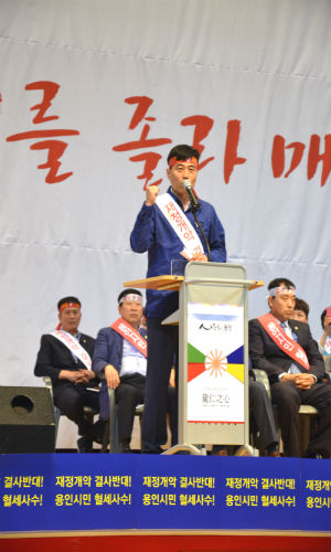 용인시민 세금 지키기 운동본부의 김대성 본부장은 “용인시가 채무상환을 위해 많은 노력을 했는데, 1인당 17만원의(약 1.724억 여원)세금을 빼앗아 가면, 우리 용인시의 재정은 파탄이날 것” 이라며 “악법개혁안 백지화를 위해, 용인시민들이 다함께 힘을 모아 끝까지 뜻을 관철시키자”고 말했다.