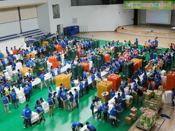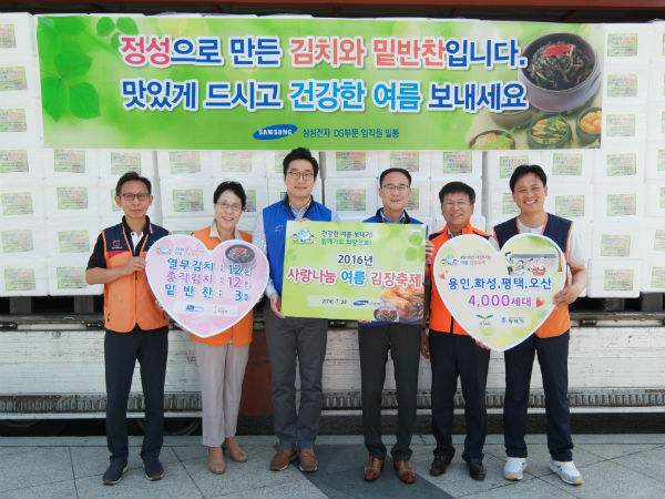 직접 씨 뿌려 수확한 여름김치 삼성전자는 22일(금) 오전, 임직원들이 직접 기르고 수확한 열무로 만든 여름김치 4천 상자(약 24톤 규모)를 용인/화성/평택/오산지역의 이웃들에게 선물했다. 삼성전자 기흥캠퍼스에서 진행된 『사랑나눔 여름 김장축제』는 무더위에 지친 이웃들에게 여름김치와 밑반찬을 전달하는 행사로 올해로 9년째를 맞았다. 이날 행사는 삼성전자 임직원들과 용인/화성/평택/오산지역의 시민봉사단체 등 자원봉사자 300여 명이 함께했다.삼성전자는 지난해부터 행사의 의미를 더하고자 임직원과 가족들이 자매마을에서 직접 파종하고 수확한 채소로 김치를 담금으로써 농촌 일손 돕기와 농가 수입확대에도 기여하고자 노력하고 있다. 저작권자 © 용인종합뉴스 무단전재 및 재배포 금지 천홍석 기자 다른기사 보기