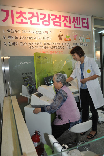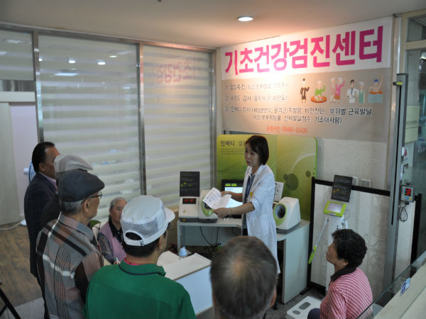 ‘기초건강검진센터’는 복지관 로비에 위치하고 있으며, 복지관 회원으로 등록되어 있으신 어르신은 누구나 혈압측정, 비만도 검사, 체성분 분석 및 골격근 진단 등을 위한 인 바디 검사까지, 한 번에 모두 측정 할 수 있어, 어르신들의 큰 호응을 불러일으키고 있다.