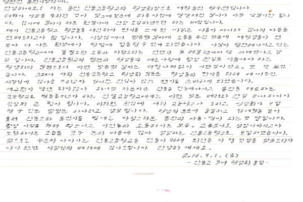주인공은 용인시 수지구 신봉고등학교에 재학 중인 박수연양(17). 자신을 신봉고 학생회장이라고 소개한 박양은, 지난 13일자로 보낸 편지에서 “학교 옆 도로에서 발생하는 소음과 차량소리 때문에 공부에 방해가 됐는데, 방음벽이 설치돼, 학업에 집중할 수 있게 됐다” 며 “신봉 고 학생 전체를 대표해 감사편지를 쓰게 됐다”고 밝혔다.