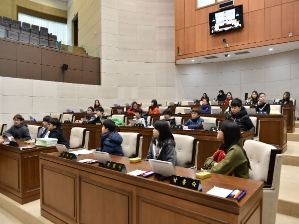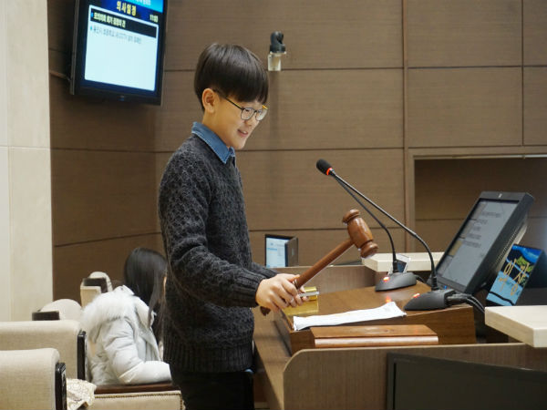 의장 역할을 맡은 전윤서 학생은 “회의를 진행 해보니 긴장되기도 하고 재미있었다. 조례가 만들어지는 과정과, 의원과 공무원이 어떤 일을 하는지, 구체적으로 알 수 있었던 시간이 되어 뜻 깊다”고 말했다.