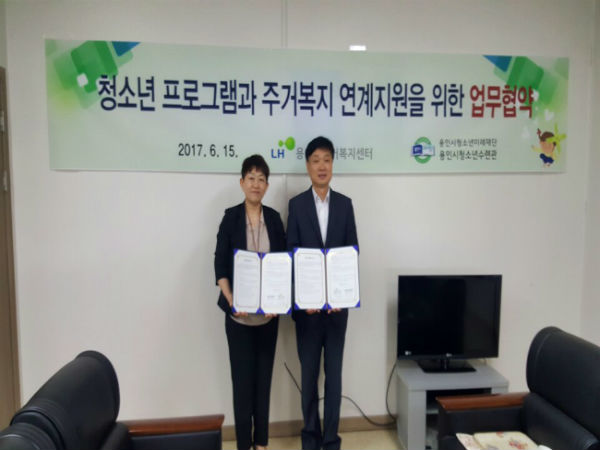 용인시청소년미래재단(이사장 정찬민) 용인시청소년수련관은 6월 15일(수) 지역 내 저소득 고령자 등 복지소외계층의 주거복지서비스 연계를 통한 지역사회 청소년프로그램의 효율적 운영을 위하여LH 용인권주거복지센터와 업무협약을 체결하였다.
