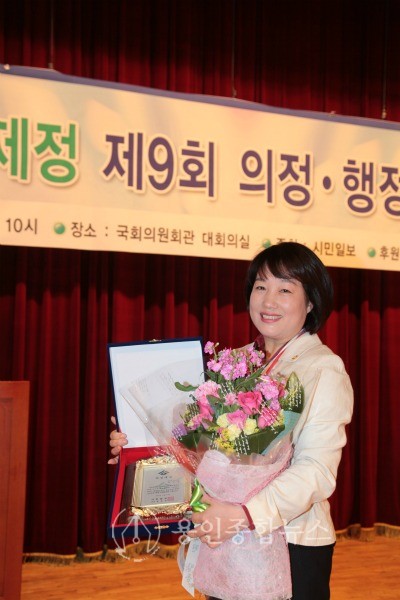용인시의회 지미연 의원이 11일 여의도 국회의사당 의원회관 대회의실에서 지방일간지가 주관하는 ‘제9회 의정․행정 대상’에서 기초의원부문 의정대상에 선정되는 영광을 안았다.