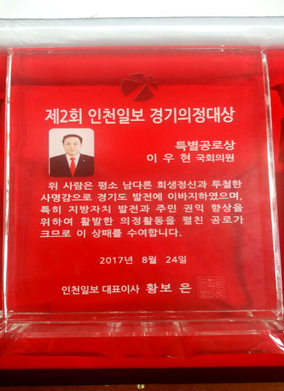 이우현 의원은 경기도민들의 성원으로 귀한 상을 받게 됐다며 “대한민국의 중심인 경기도의 발전과, 도민들의 삶의 질 향상을 위해 맡은 바 역할에 최선을 다하겠다.”고 말했다.