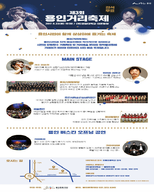 오후 7시부터 시작되는 거리축제는, 용인 버스킨 아티스트들의 공연, 성악가 김동규와 인기가수 이승철씨의 공연 등 다양한 무대가 준비돼 있다. 이외에도 문화제가 개최되는 이틀간, 육아박람회, 거북선전시회, 용인시민사진전, 친환경농산물 판매부스 등도 함께 운영된다.