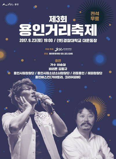 (재)용인문화재단(이사장 정찬민)은 ‘제3회 용인거리축제’를, 9월 23일(토) 오후 7시 (옛)경찰대학 대운동장에서 개최한다. 이번 축제에서는 지난 30여 년 동안 2천회가 넘는 공연을 통해, 대한민국 최고의 보컬리스트로 사랑받고 있는 가수, 이승철의 환상적인 무대가 펼쳐진다. 이승철은 국내 최정상의 연주자들과 함께 특별한 무대와 레퍼토리로 용인시민에게 잊을 수 없는 감동과 추억을 선사할 예정이다. ‘희야’, ‘오직 너뿐인 나를’, ‘NEVER ENDING STORY’ 등 이승철의 주옥같은 히트곡과 함께하는 약 1시간의 무대가 펼쳐지는 용인거리축제, 문화로 하나 되는 용인 시민을 위한 축제가 될 것이다.