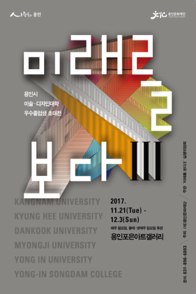 올해 3회째를 맞는 ‘미래를 보다Ⅲ’전은, 용인의 시각예술을 이끌 대학생들의 예술창작 활동을 장려하고, 미래 지역 예술가를 발굴하기 위해 기획되었으며, 용인에 소재하고 있는 강남대학교, 경희대학교, 단국대학교, 명지대학교, 용인대학교, 용인송담대학교 등 6개 학교 미술·디자인 전공 50여명이 참가하며, 회화, 도예, 패션, 디자인 등 각 학교 졸업 전시 작품 중 학교 및 전공 별 각기 다른 특색과 대학생들만의 참신함을 작품으로 만날 수 있다.
