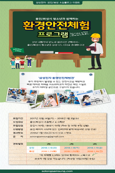 삼성전자 '환경안전 체험 프로그램' 참가 희망자는 1월 3일까지 '삼성전자·용인/소통블로그'(http://www.sotongsamsung.com/)에서 신청할 수 있고 추첨 결과는1월 5일 오후 4시에 블로그를 통해 발표된다.