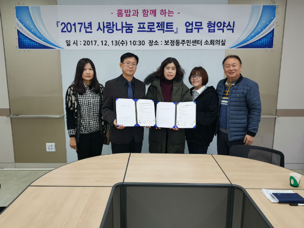 한편 보정동은 복지사각지대 주민을 위해, 홈밥을 포함해 고시원,교회,장애인복지관,학원,법률사무소,수제버거제조업체,음식점,세탁소 등 총 9곳과 이웃돕기 협약을 체결했다.