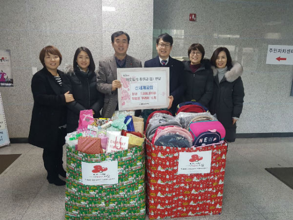 신세계교회는 성금 100만원과 함께 관내 저소득층 초등학생 19명에게 전해 달라며, 200만원 상당의 학용품꾸러미(책가방과 학용품 20여종)를 기탁했다.