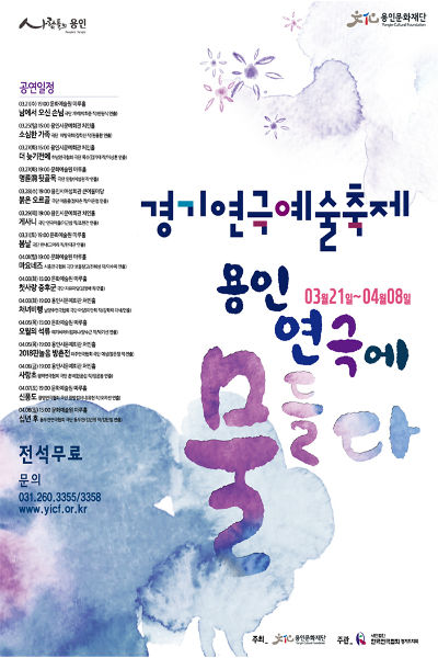 (재)용인문화재단(이사장 정찬민)은 3월 21일부터 4월 8일까지 ‘경기연극예술축제’를 문화예술원 마루홀, 용인시문예회관 처인홀, 용인시여성회관 큰어울마당 등 총 3개 공연장에서 개최한다. 용인문화재단 주최, 한국연극협회 경기도지회 주관으로 개최되는 이번 ‘경기연극예술축제’는 총 15개 연극 공연을 선보이는 축제로 연극을 주제로 한 문화 축제로 펼쳐질 예정이다.